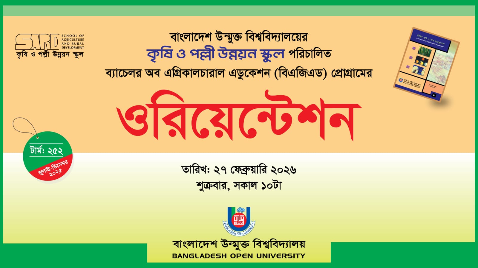 বাংলাদেশ উন্মুক্ত বিশ্ববিদ্যালয় (বাউবি) এর কৃষি ও পল্লী উন্নয়ন স্কুল পরিচালিত বিএজিএড (Bachelor of Agricultural Education) প্রোগ্রাম-এর ২৫২ টার্মের (জুলাই-ডিসেম্বর ২০২৫) ২য়, ৪র্থ ও ৬ষ্ট সিমেষ্টারে ভর্তি ও রেজিস্ট্রেশনকৃত নবাগত শিক্ষার্থীদের ওরিয়েন্টেশন প্রোগ্রাম ২৭ ফেব্রুয়ারি ২০২৬, শুক্রবার সকাল ১০টায় সারাদেশের ১৫টি স্টাডি সেন্টারে একযোগে অনুষ্ঠিত হয়েছে ... Read More
